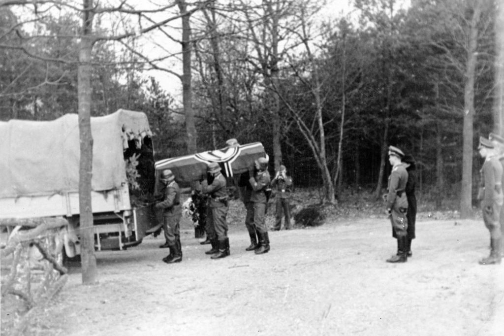 De groepsleider van de N.S.D.A.P., de heer Oestreich, strooide zand op de kist, daarna strooiden velen bloemen.